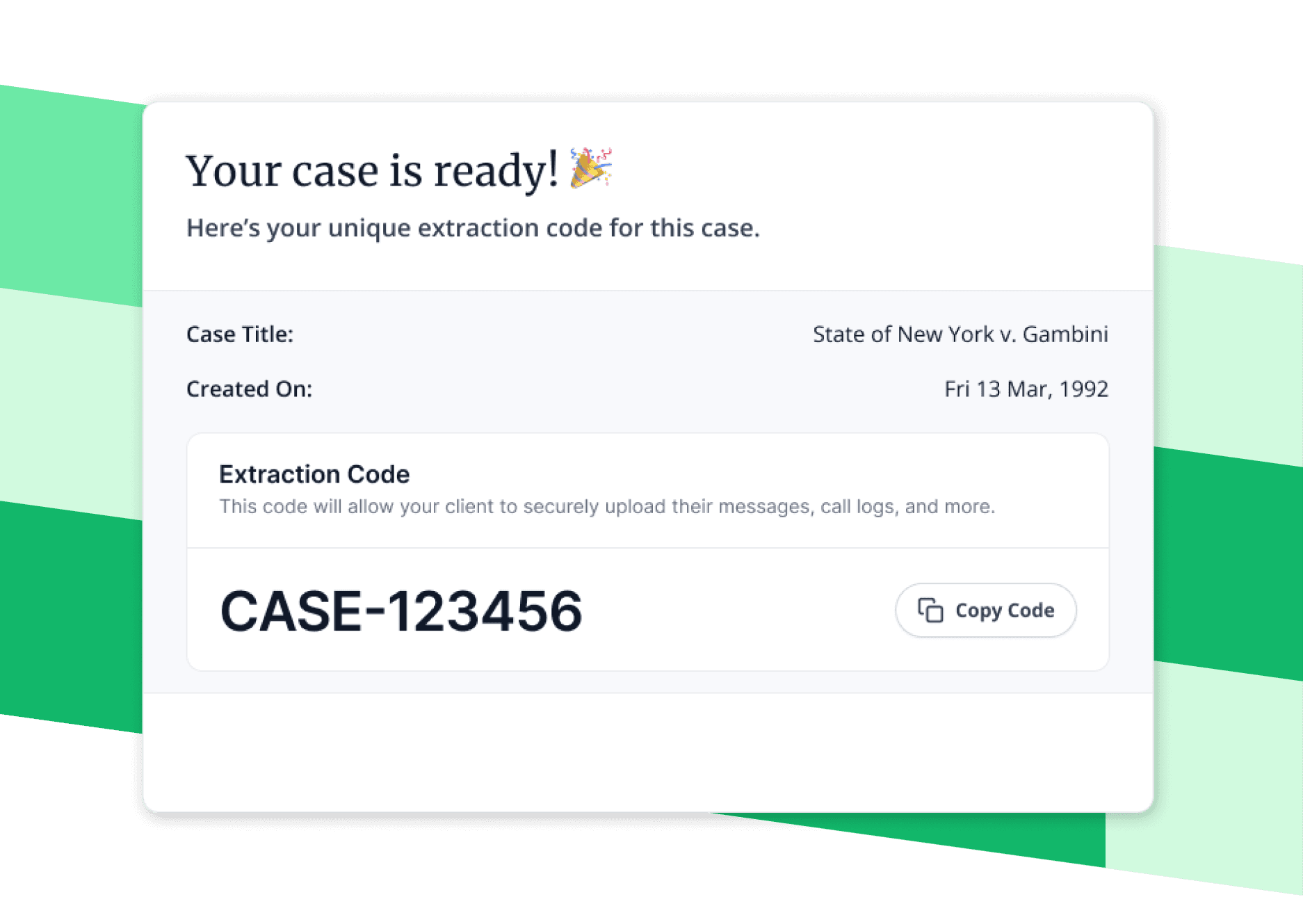 Extraction Codes are unique identifiers that connect our Desktop Extractor App directly to a specific case created by a lawyer. This means you can bypass the need for clients to create accounts or log in, making the process as simple as sending them a code.